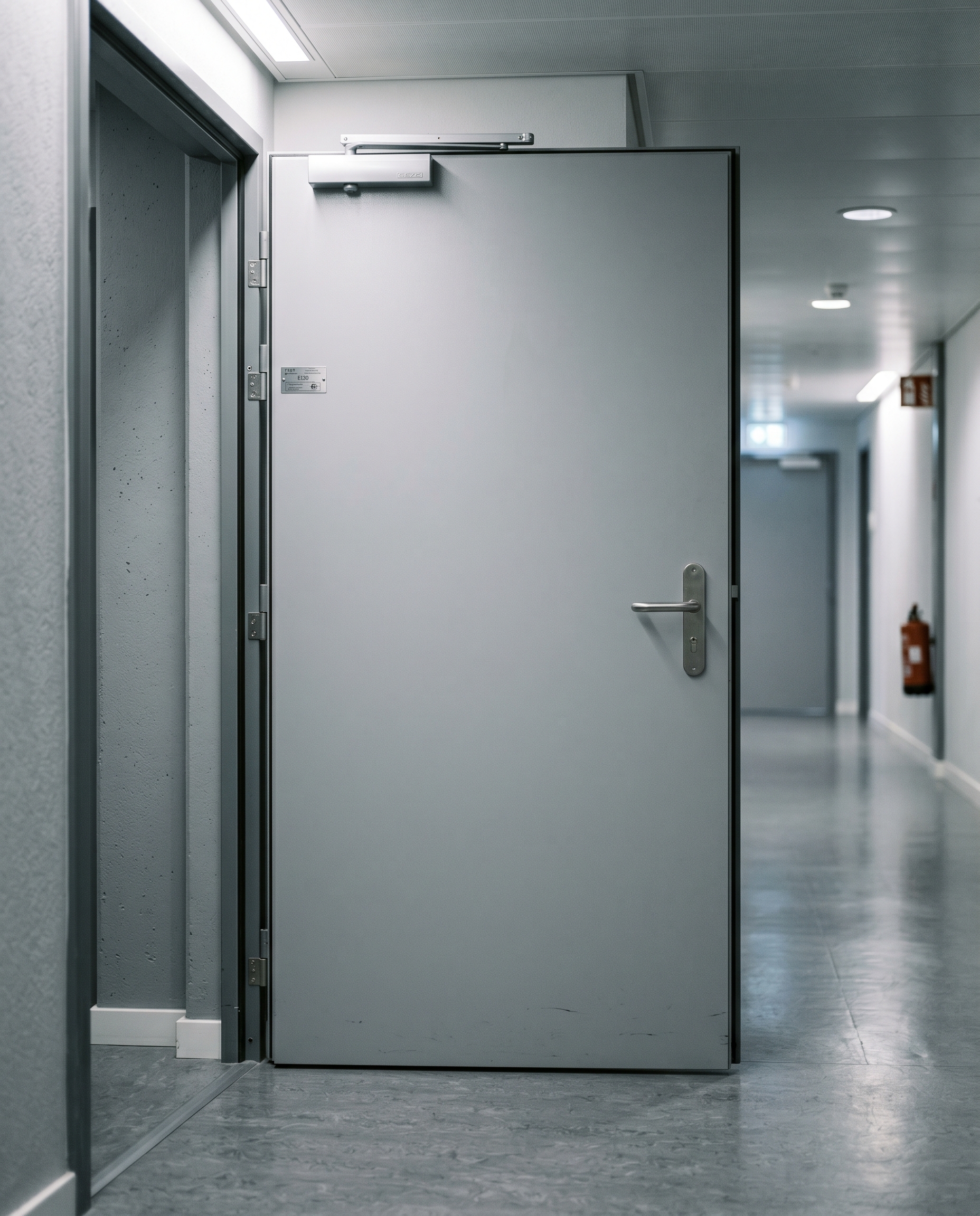 Résistance au feu 30, 60 ou 90 minutes selon NF EN 1634-1. Étanchéité flammes et isolation thermique, plaque signalétique fabricant obligatoire, paumelles et ferme-porte certifiés.